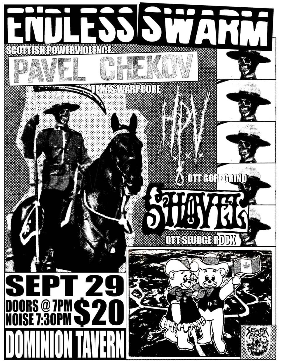 Endless Swarm and Pavel Chekov invade the nation's capital on Monday, Sept 29 with local support from Ottawa's own HPV and Shovel! This evening of raw blasting violence, pus-filled gore and vomit-inducing sludge is going down at Dominion Tavern in the Byward Market for $20 at the door!
